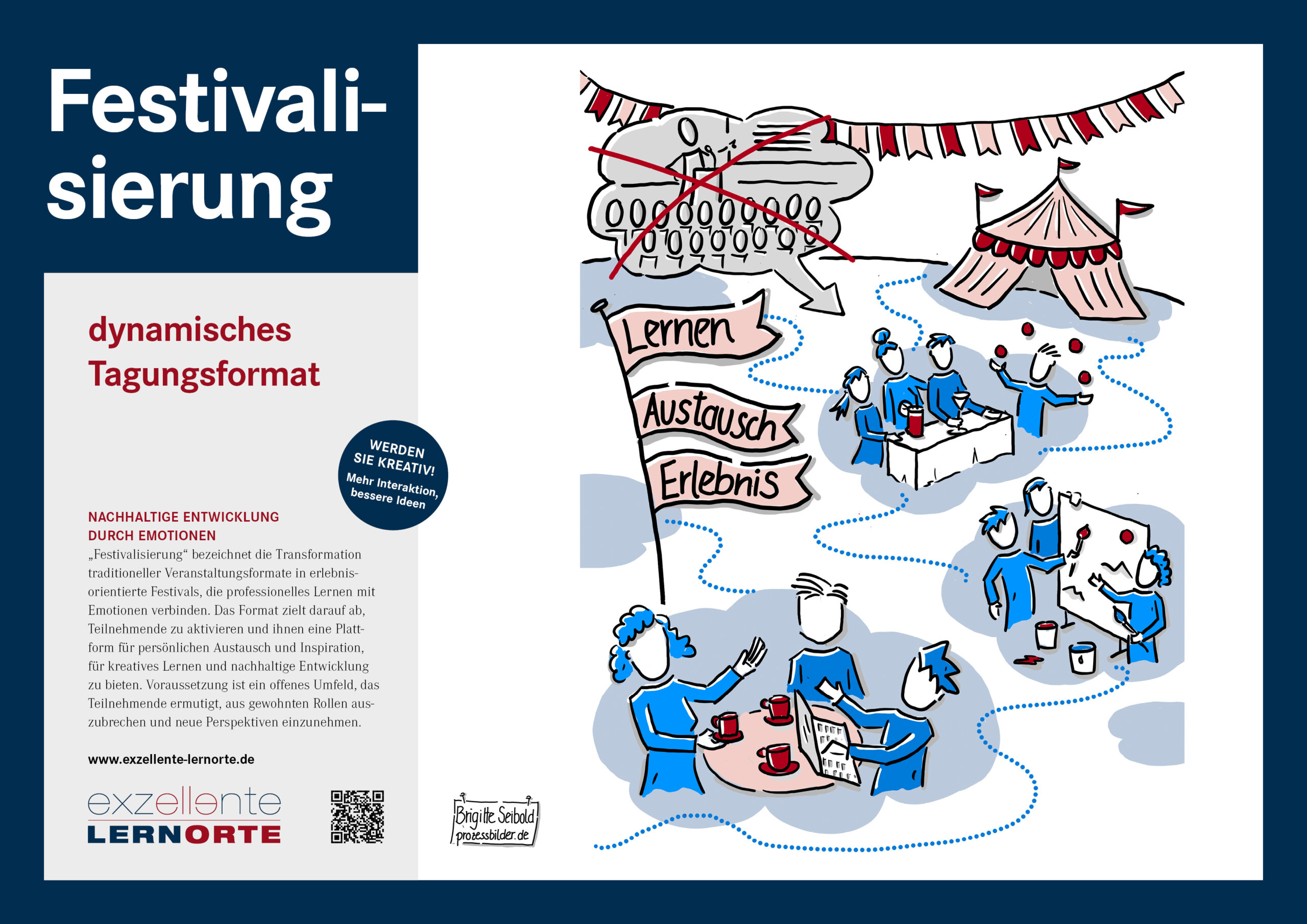 „Festivalisierung“ bezeichnet die Transformation traditioneller Veranstaltungsformate in erlebnisorientierte Festivals, die emotionale Erlebnisse mit professionellem Lernen verbinden. Das Format zielt darauf ab, die Teilnehmenden aktiv einzubinden und ihnen eine Plattform für Austausch, Inspiration und kreatives Lernen zu bieten.