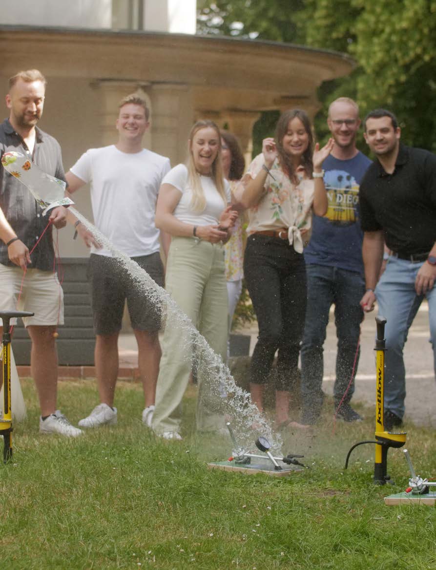 Mit einer Luftpumpe bauen Sie Druck in der Flasche auf und die Teams schießen Ihre Konstruktionen auf eine Höhe von bis zu 20 Metern. Vor allem im Sommer sorgt dies für eine ausgelassene Atmosphäre, mit der Sie entspannt in die Tagung starten können.