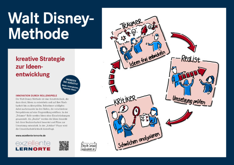 Die Walt-Disney-Methode ist eine Kreativtechnik, die dazu dient, kreative Ideen zu entwickeln und auf ihre Machbarkeit hin zu überprüfen. Sie basiert auf drei Rollen, in die die Teilnehmer schlüpfen: der Träumer, der Realist und der Kritiker. Jede Rolle eröffnet eine spezifische Perspektive auf die zu lösende Fragestellung.